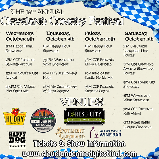 - Wed, Oct 08Cleveland Comedy Festival - All StagesOne price gets you into all CCF-hosted shows. Complimentary Festival shirt comes with purchase!